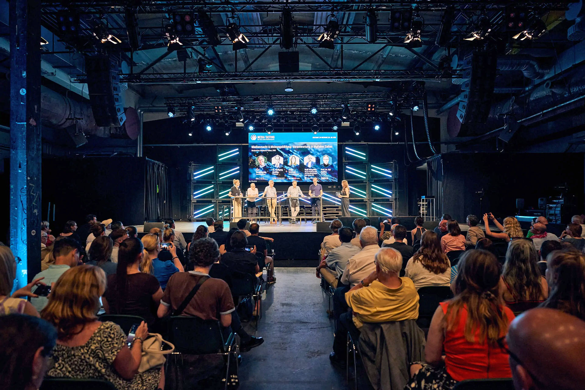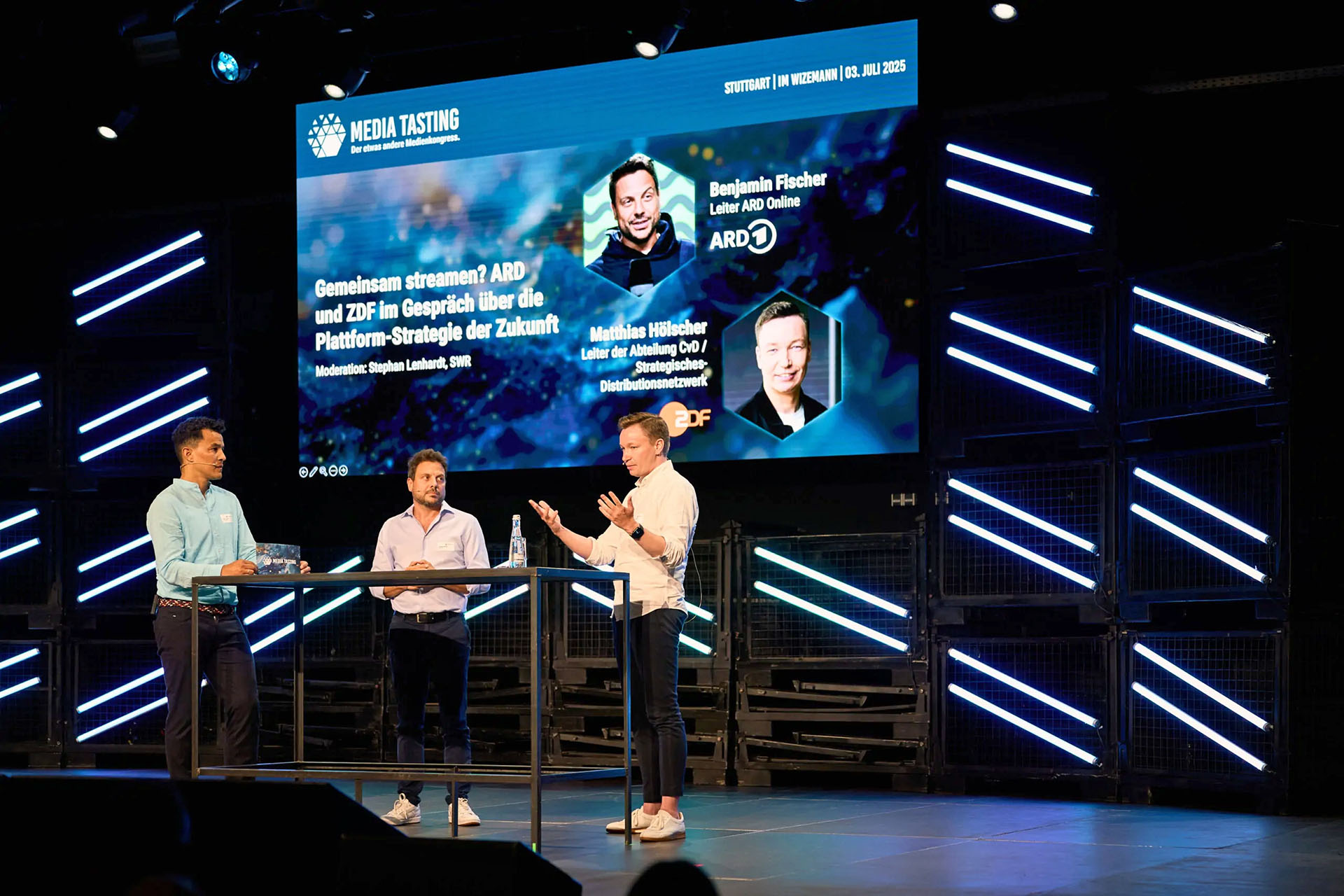 Beim Mediatasting im Wizemann Areal Stuttgart trafen sich Medienprofis und Kreative zum Austausch über Innovation und Zukunft der Branche. Unser b&b Team durfte den passenden Rahmen gestalten – ein Bühnenbild, das reduziert und dennoch wirkungsvoll ist.