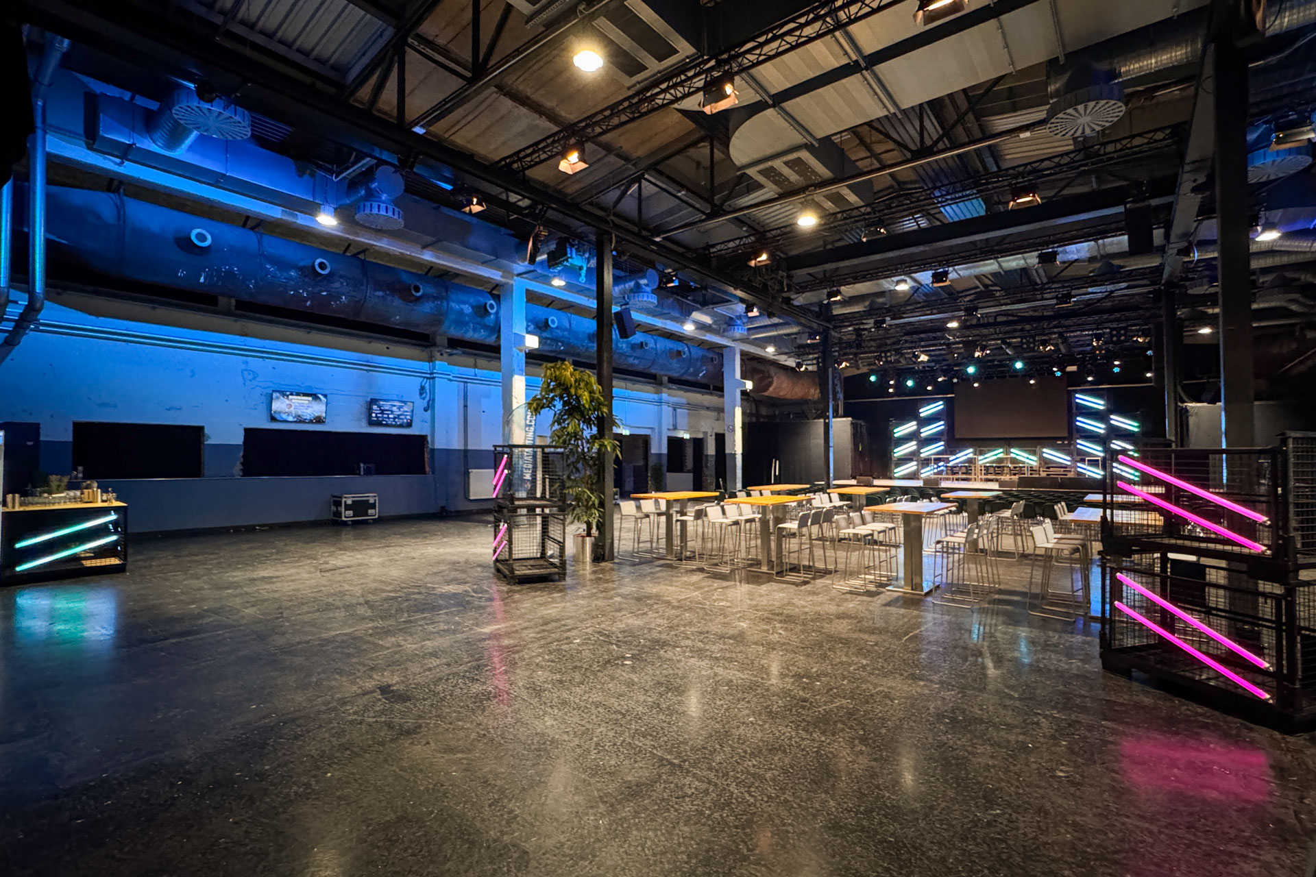 Im Zentrum standen Gitterboxen, die als markante Gestaltungselemente für einen rauen Industrial Look sorgten. In Kombination mit Astera LED-Sticks entstanden Lichtobjekte, die Tiefe, Struktur und Atmosphäre schufen – sowohl auf der Bühne als auch als wiederkehrendes Element im gesamten Raum.