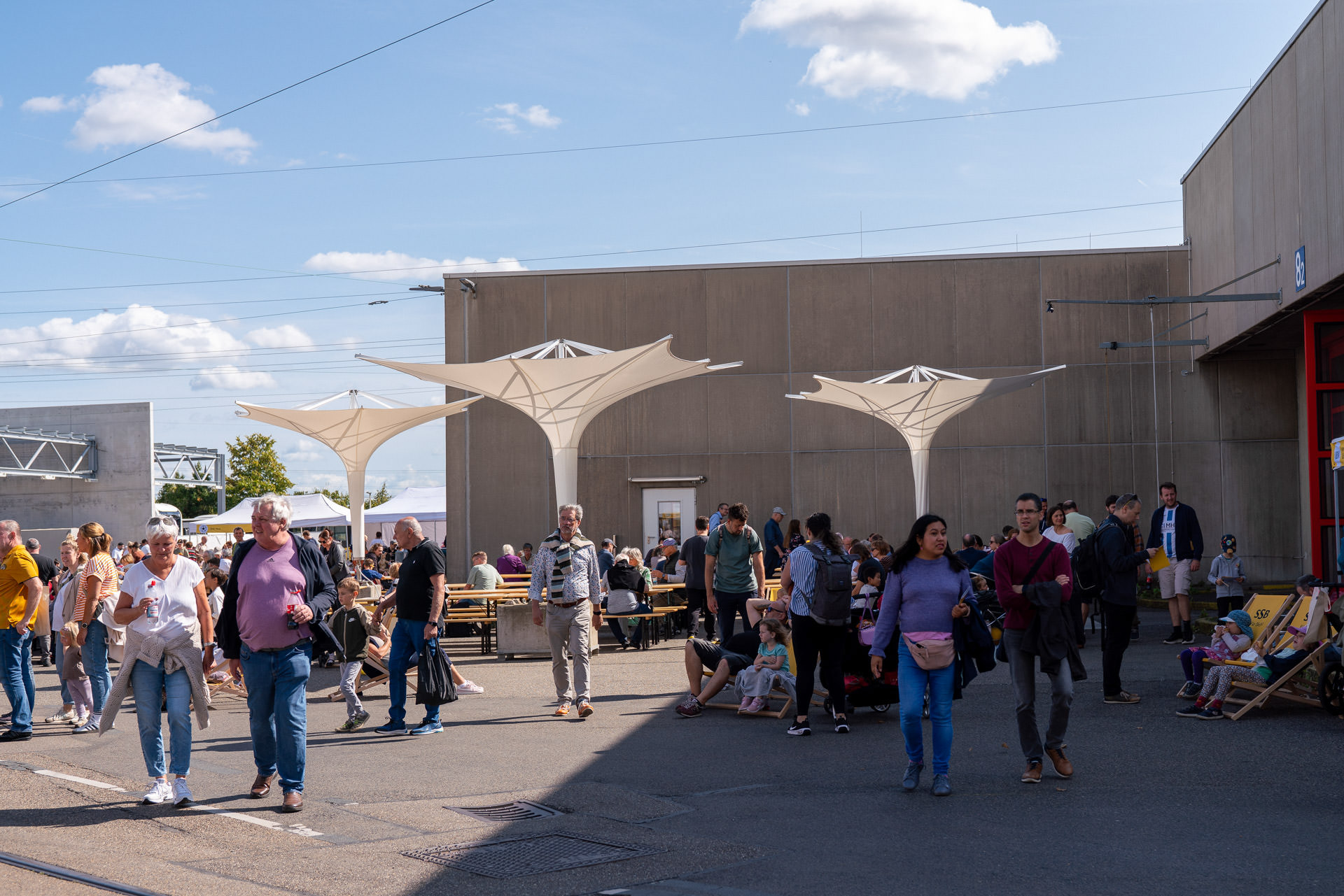 Das b&b Team stellte Pavillons, Bierbankgarnituren, Sonnenschirme und weiteres Mobiliar bereit. Auch die Stromversorgung, Geländebegrenzungen, Wegeleitung, Notfalldurchsagen und die Besucherzählung wurden von uns organisiert. Alles mit dem Ziel, das Gelände klar strukturiert, sicher und einladend zu gestalten.